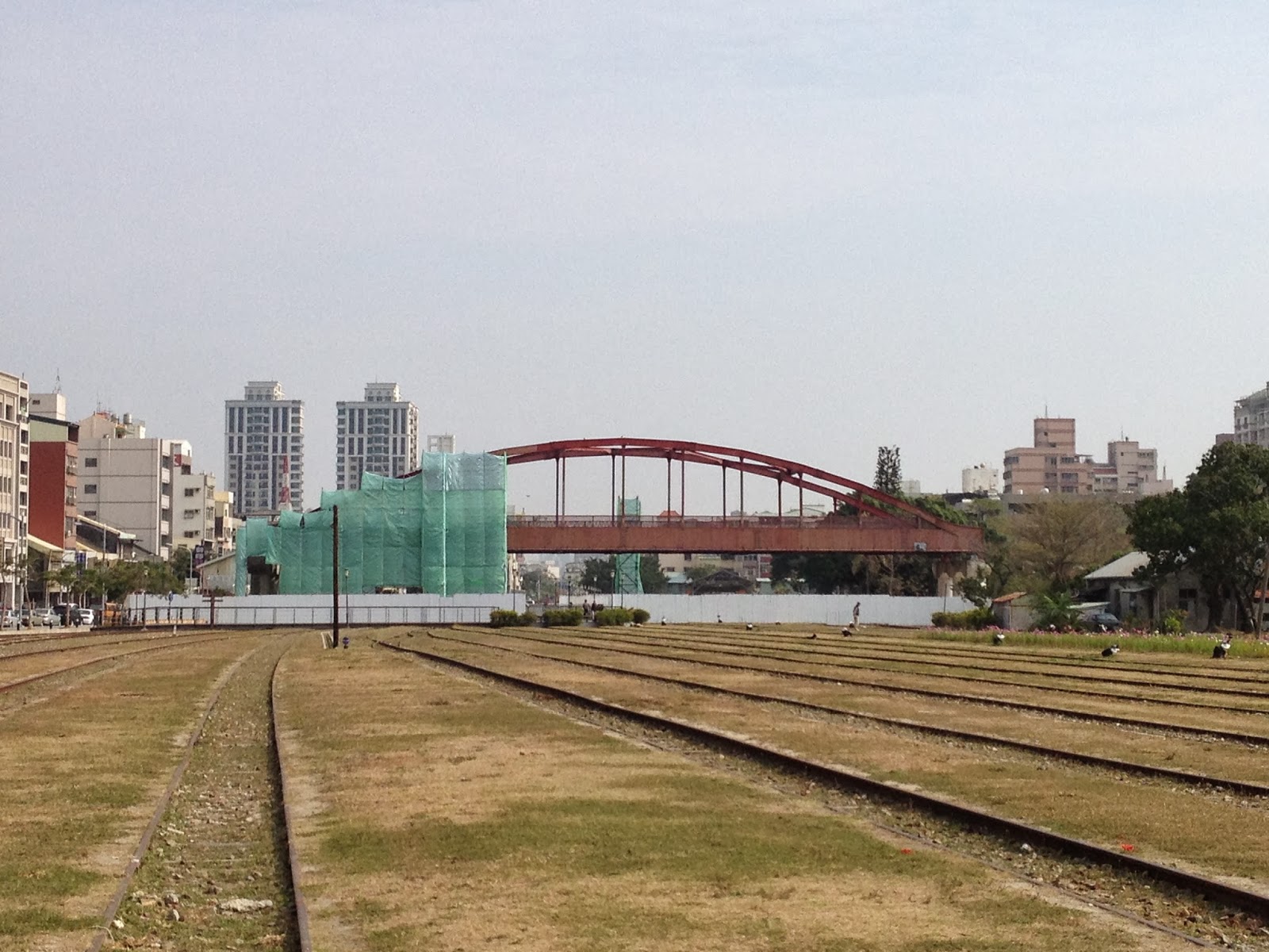 遠方的公園陸橋,拆除後只剩下鋼樑的橋身部份,正進行改造,整修後將成為新的景點。